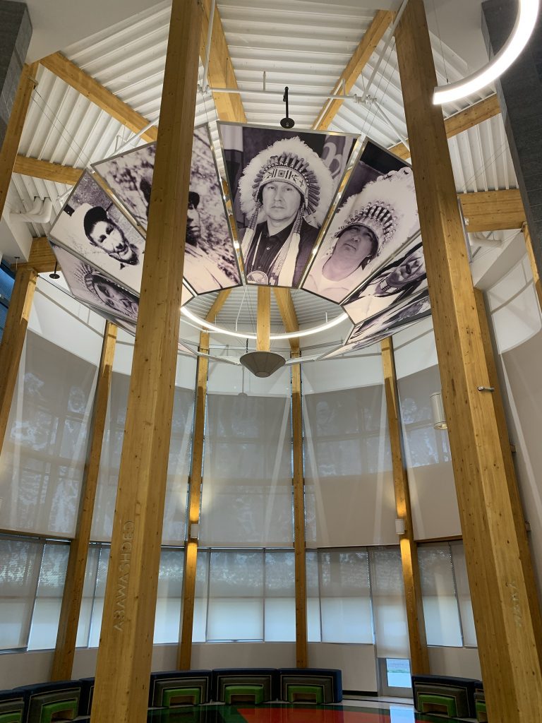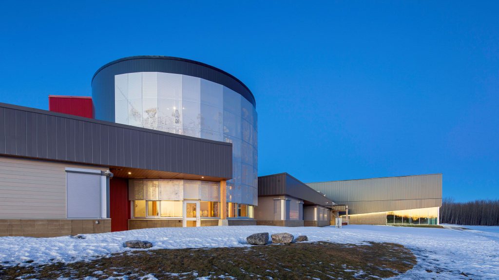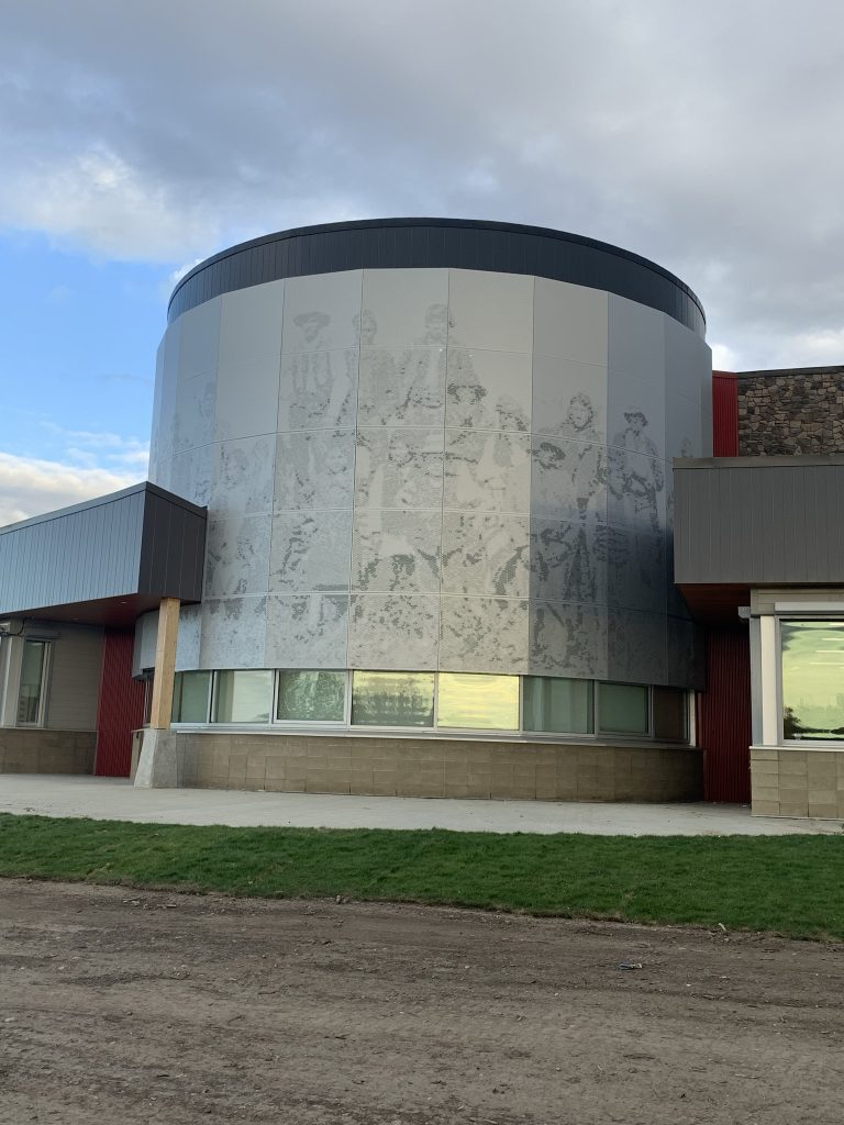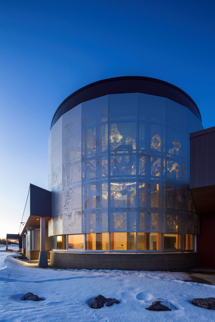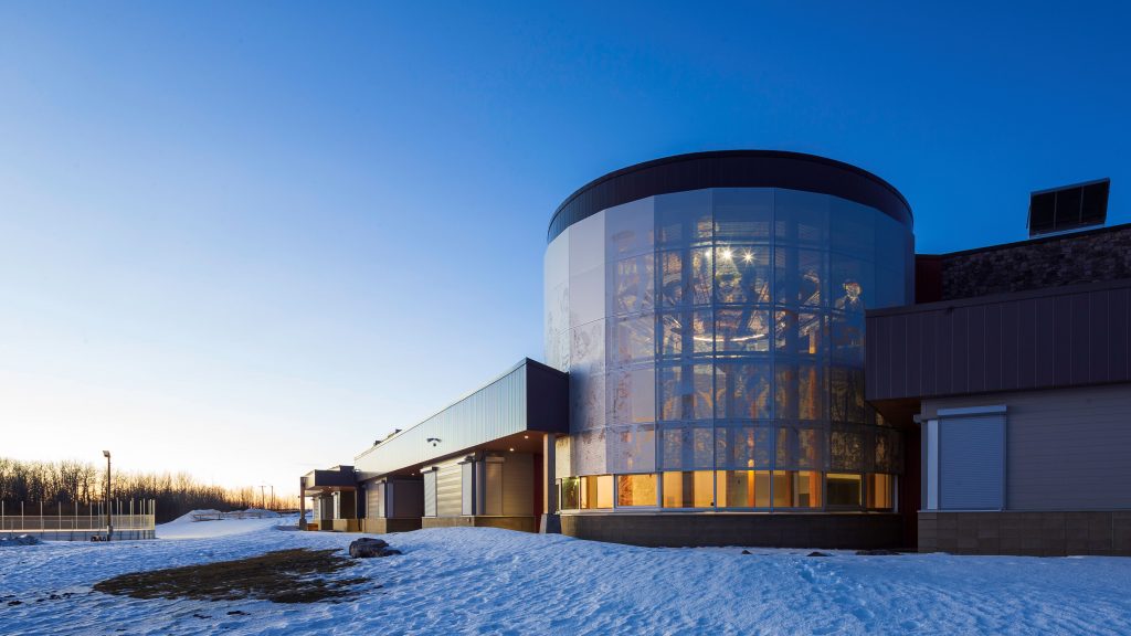 Construction highlights include engraved mass timber framing throughout the building, a curved curtain wall in the ceremony space, cultured stone exterior walls, and custom imaged fibre reinforced laminate panels showcasing the history of the community.